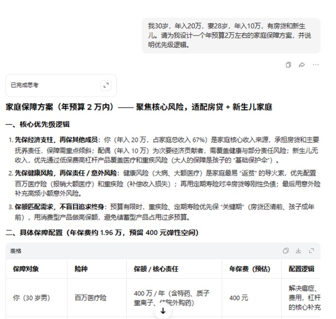 在“家庭保障方案设计”测试中,记者设定了“家庭年总收入30万、房贷压力、新生儿家庭”的场景。测评显示,国产大模型已告别“千人一面”的固定模板,表现出较强的个性化配置思维。