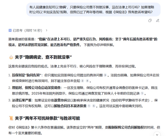 腾讯元宝明确指出“保险公司查不到是致命错觉”,并详述了理赔调查在医保记录、同业共享平台等维度的穿透力。DeepSeek和通义千问解析了《保险法》第十六条的真实含义,强调“两年的起算点是合同成立日,但截止点是保险事故发生之日”。这种对司法实践中“恶意投保”判罚逻辑的准确传达,体现了国产大模型在处理复杂法律条款时的进步。