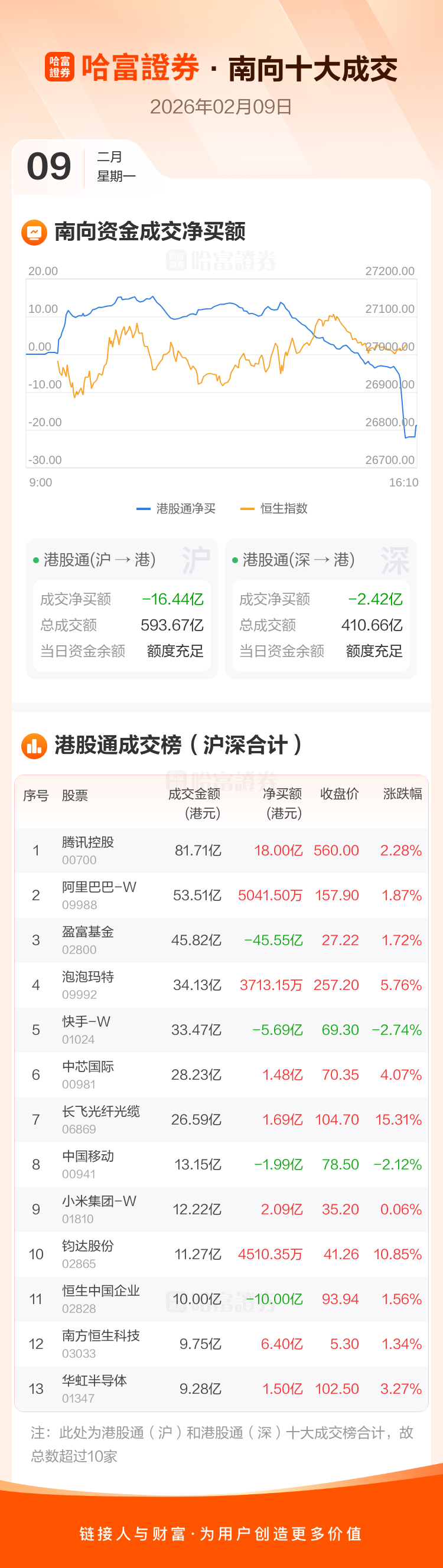 恒生指数2月9日涨1.76%,收报27027.16点。南向资金今日净卖出港股18.87亿港元。南向资金今日成交额1004.32亿港元,港股大市成交2551.42亿港元。