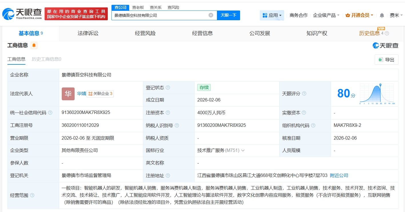 南方财经2月9日电,天眼查App显示,近日,景德镇吾空科技有限公司成立,法定代表人为华婧,注册资本4000万人民币,经营范围包括智能机器人的研发、智能机器人销售、服务消费机器人制造、服务消费机器人销售等,由北京银河通用机器人股份有限公司、景德镇冰河文旅科技有限公司共同持股。