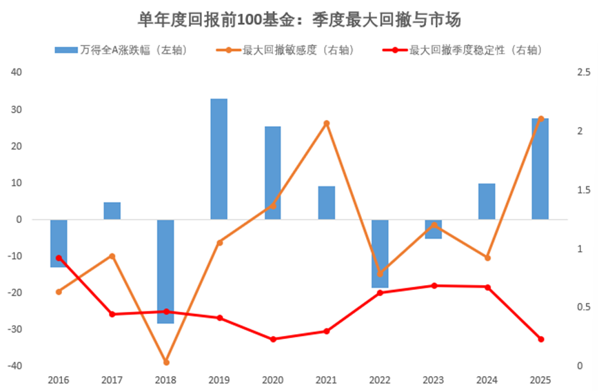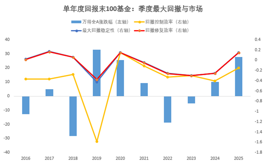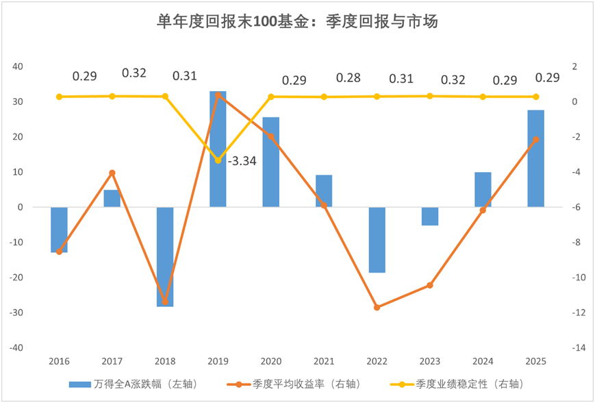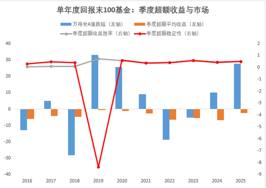 从业绩上看,2016年至2025年各年度回报前100的全市场主代码基金,过去一年的各季度平均回报与市场表现完全一致,平均季度业绩胜率几乎不变,但季度业绩稳定性则与市场相反,除2018年外,行情越差稳定性的价值就越高,行情越好稳定性的价值就越小。