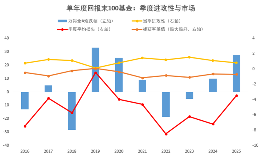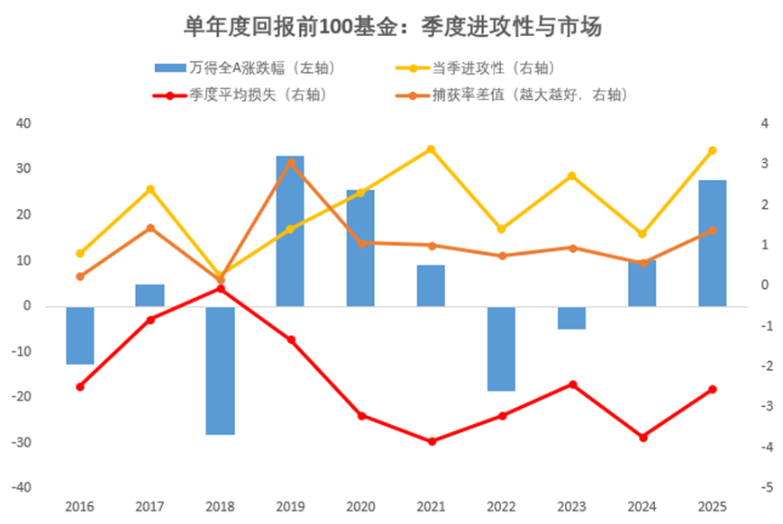 观察前100基金,在进攻性最强的年份(如2021年,3.38),其季度平均损失均值也控制得相对较好(-3.84),这意味着 “高进攻性”建立在相对可控的回撤基础上。