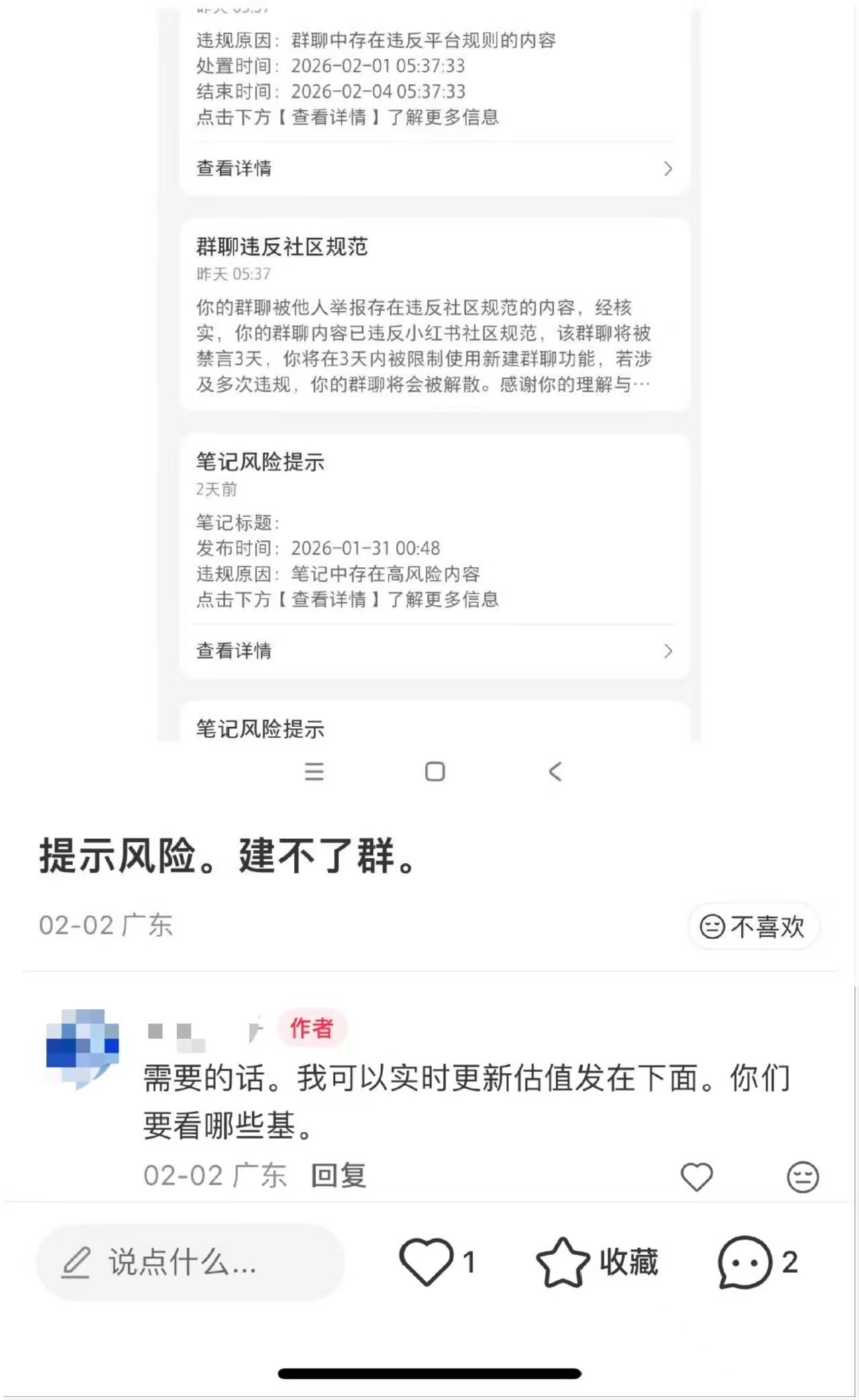 目前仍有不少小红书账号在发布基金实时估值工具的相关教程,不少博主称工具正在进一步测试与调整。同时记者也注意到,有博主发的笔记并未直接分享小程序或软件,而是在评论区回复网友“私”或是进群后再分享。此外,记者发现有博主表示被举报群聊涉及违规,“建不了群”,并表示可以在评论区更新估值。