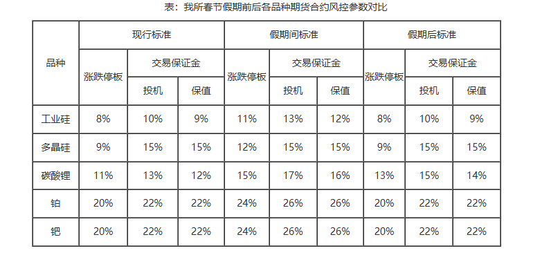 自2026年2月12日(星期四)结算时起,工业硅期货合约涨跌停板幅度调整为11%,投机交易保证金标准调整为13%,套期保值交易保证金标准调整为12%;多晶硅期货合约涨跌停板幅度调整为12%,投机交易保证金标准、套期保值交易保证金标准维持不变;碳酸锂期货合约涨跌停板幅度调整为15%,投机交易保证金标准调整为17%,套期保值交易保证金标准调整为16%;铂、钯期货合约涨跌停板幅度调整为24%,投机交易保证金标准、套期保值交易保证金标准调整为26%。