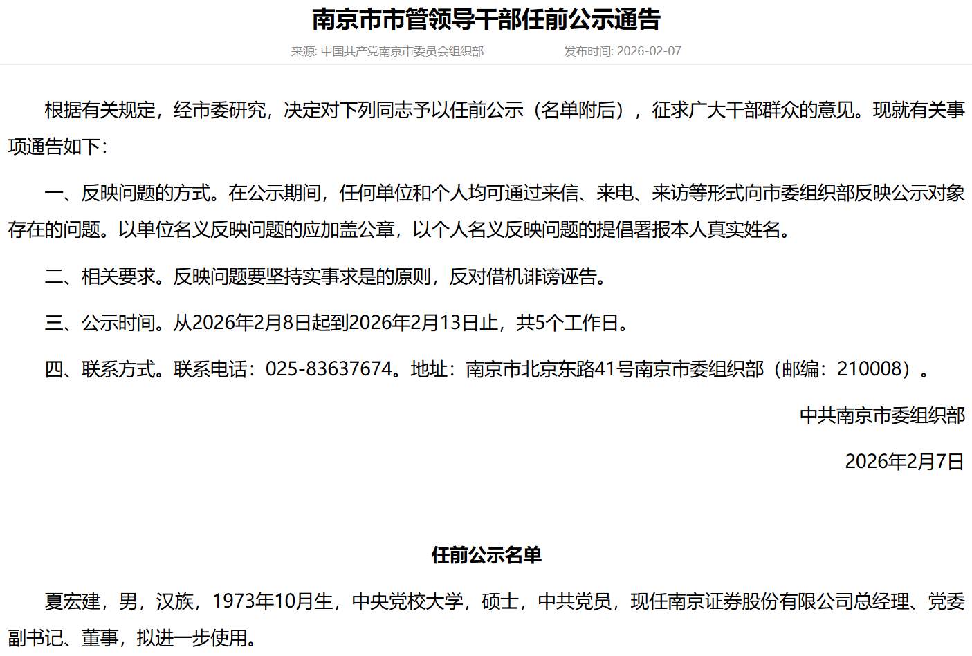 据南京党建官网,近日,南京市发布市管领导干部任前公示通告:夏宏建,男,汉族,1973年10月生,中央党校大学,硕士,中共党员,现任南京证券股份有限公司总经理、党委副书记、董事,拟进一步使用。