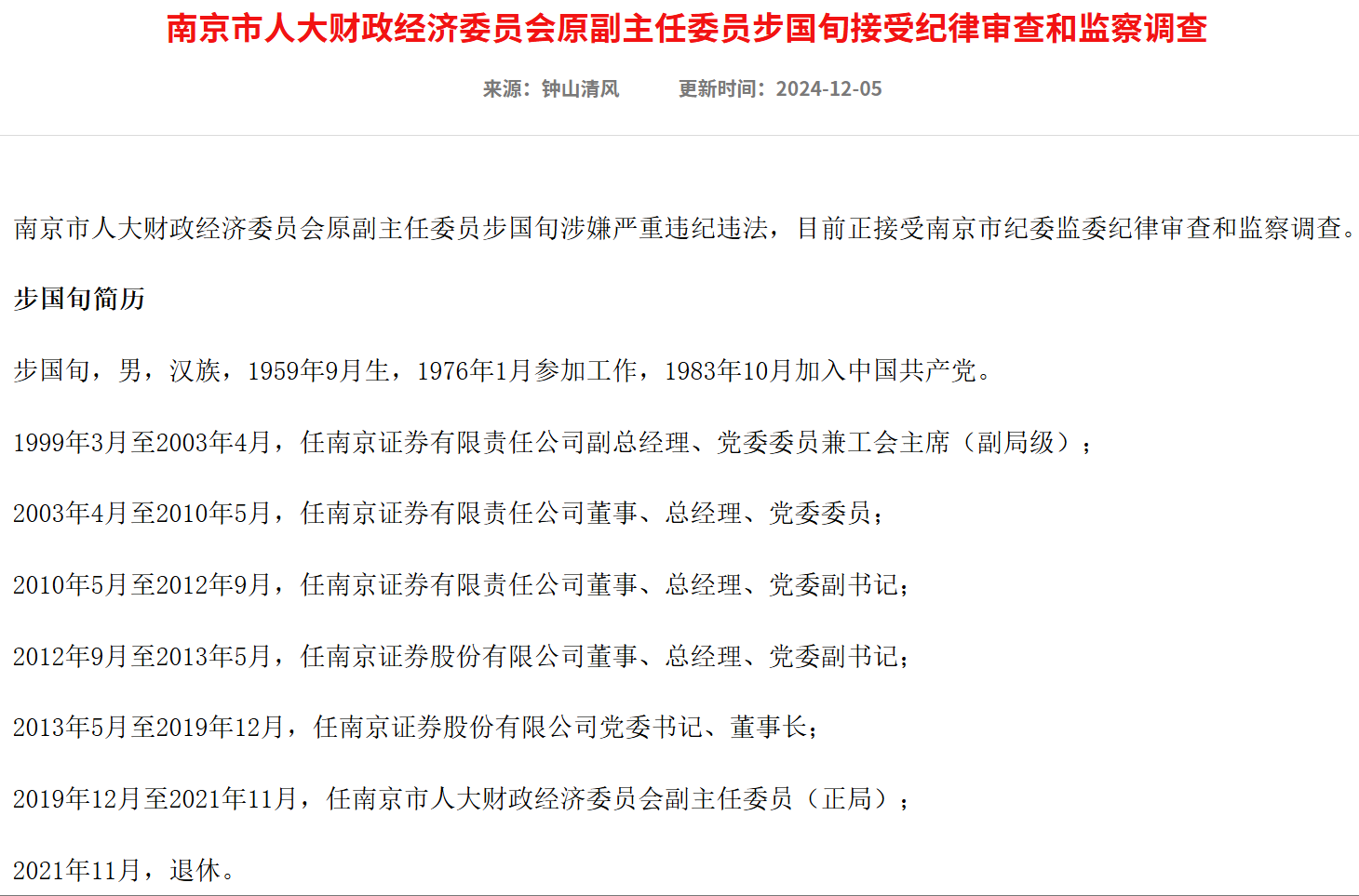 2024年12月5日,南京市纪委监委官方微信公众号“钟山清风”披露,南京市人大财政经济委员会原副主任委员步国旬涉嫌严重违纪违法,目前正接受南京市纪委监委纪律审查和监察调查。