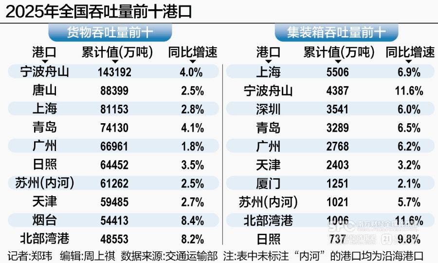 近日,交通运输部披露2025年全国主要港口货物、集装箱吞吐量数据。与2024年比,2025年全国吞吐量前十港口排名保持稳定,其中集装箱吞吐量超千万的港口扩容至9个,苏州港(内河)和北部湾港集装箱吞吐量分别达到1021万标箱、1006万标箱。