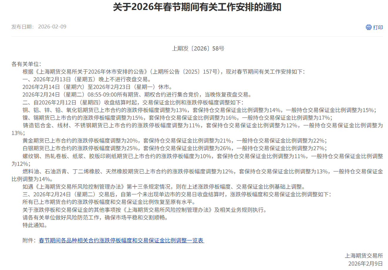 自2026年2月12日(星期四)收盘结算时起,交易保证金比例和涨跌停板幅度调整如下: