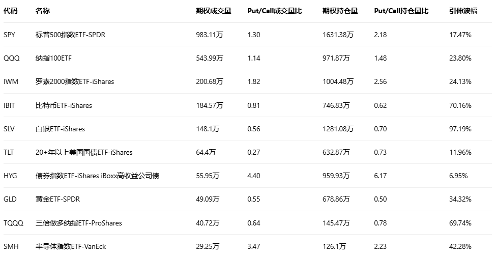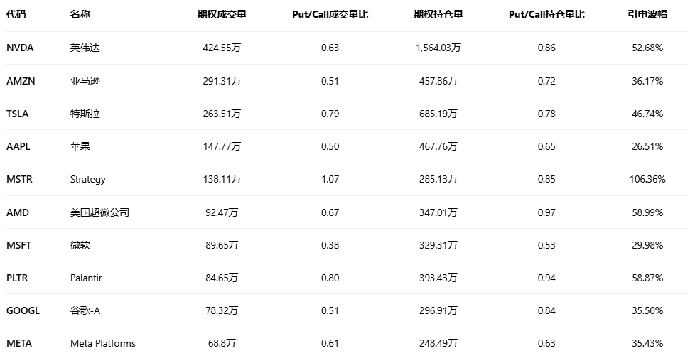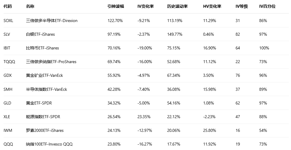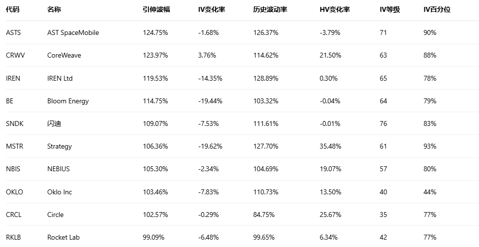 引申波幅排行榜(标的市值>10亿美元,且期权成交量>10万)