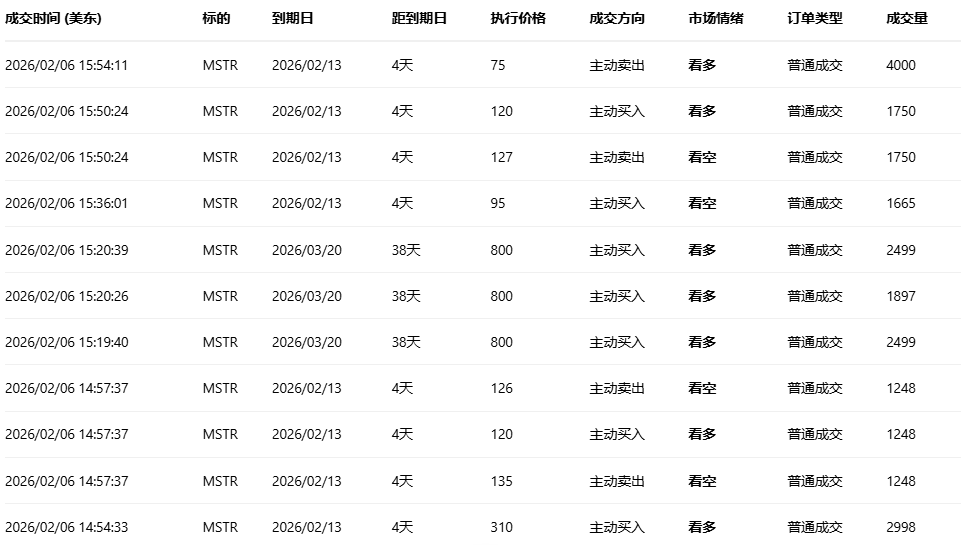 Strategy收涨26.11%,成交138.11万份期权合约,看跌/看涨成交量比降至1.07。Strategy第四季度净亏损124亿美元后股价暴涨26%,比特币重回7万美元上方。