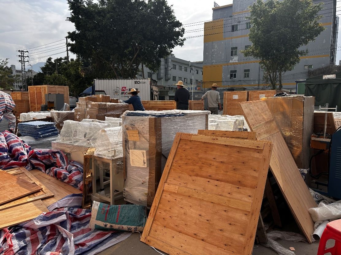 一进工厂大门,记者就看到院子内的工人们正在打包各类型设备。据工作人员介绍,现场设备包括剪板机、铸锭机、抛光机等。