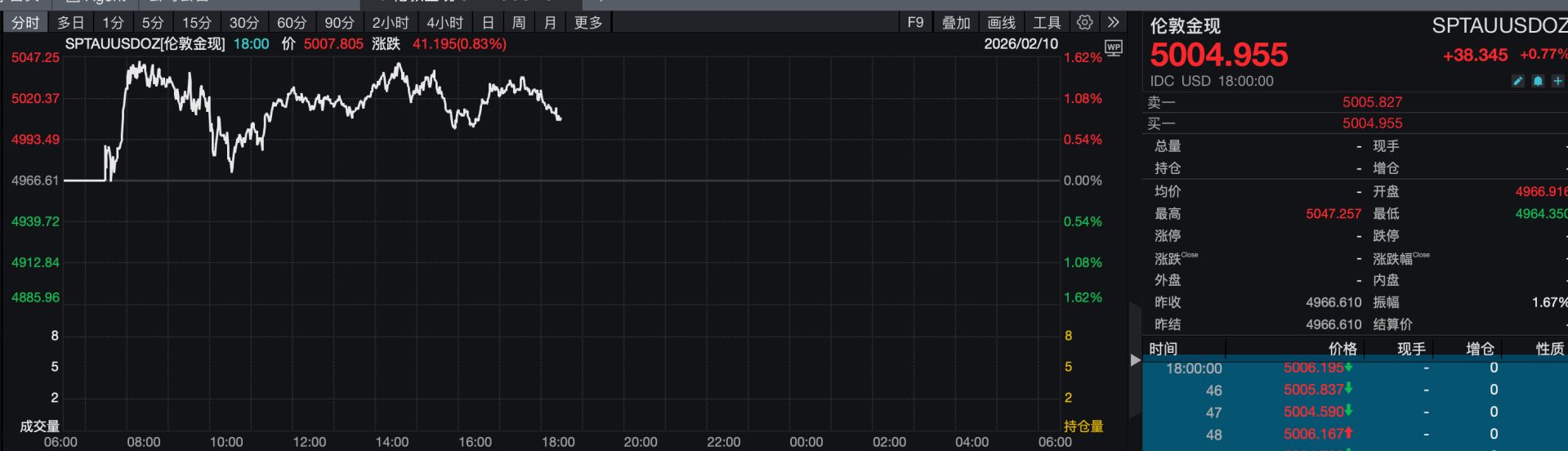 在经历此前暴跌后,国际金价近日开始企稳。截至北京时间2月9日18时,伦敦金现当日上涨超0.5%,价格约为5005美元/盎司。