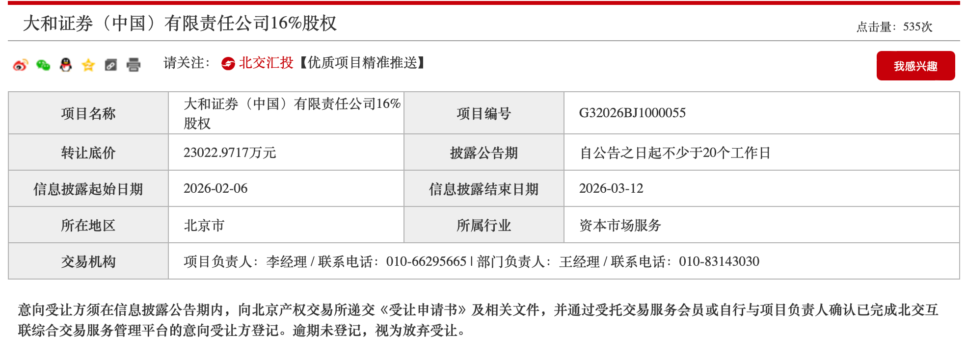 转让方案要求这两笔股权必须“捆绑出售”,不接受单独购买。挂牌信息明确,持有51%控股权的日本大和证券集团总公司并未放弃优先购买权。
