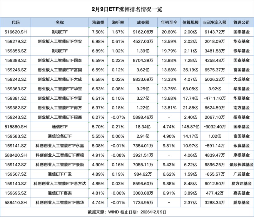 总体来看,今日ETF市场共有1381只产品上涨。其中,影视ETF、创业板人工智能ETF华安涨幅居前,日涨幅高达7.5%和6.98%。