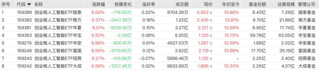 跟踪创业板人工智能指数的ETF共有8只。其中,华安基金旗下的AI创业ETF涨幅最高,日涨幅达6.98%,富国基金旗下的创AI富国ETF和国泰基金旗下的创业AIETF日涨幅为6.59%,大成、华宝、华夏、南方、招商旗下相关ETF日涨幅也超6%。