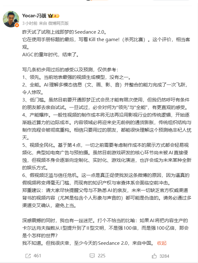 冯骥发文称:“昨天试了试刚上线即梦的Seedance 2.0。它在使用手册标题的最后,写着Kill the game!(杀死比赛)。这个评价,相当客观。AIGC的童年时代,结束了。”他用领先、全能、低门槛、产能爆炸、视频全民化等词来表达了自己的使用感受,并对未来假视频泛滥与信任危机提出了担忧。同时,他感到庆幸,“至少今天的Seedance 2.0,来自中国。”