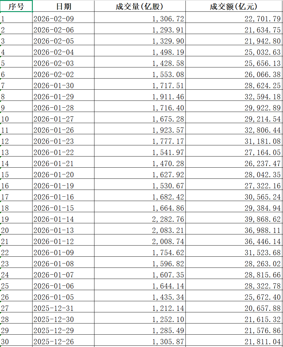 央广网北京2月9日消息(记者牛谷月)9日收盘,A股成交额达到2.27万亿元,较上一交易日放量超1千亿元。央广财经记者梳理发现,这是自2025年12月26日起,A股成交额连续第30个交易日保持在2万亿元以上。