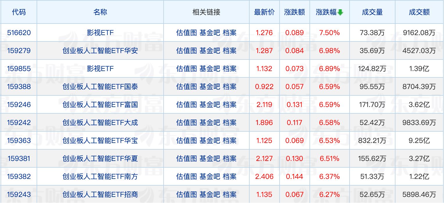 ETF涨跌幅方面,影视、创业板人工智能相关ETF涨超6%。