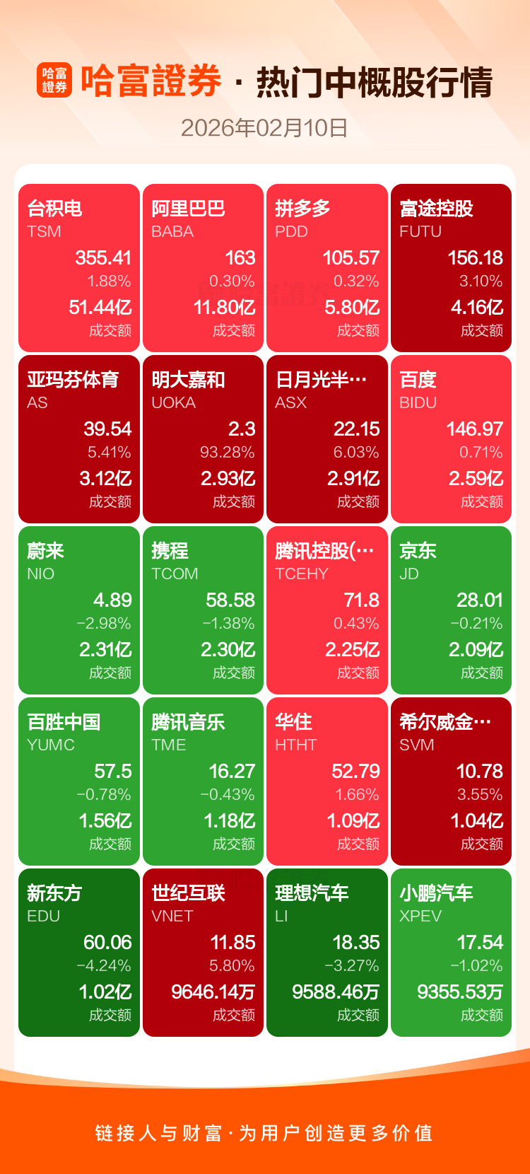 台积电涨1.88%,阿里巴巴涨0.30%,拼多多涨0.32%,富途控股涨3.10%,亚玛芬体育涨5.41%,明大嘉和涨93.28%,日月光半导体涨6.03%,百度涨0.71%,蔚来跌2.98%,携程跌1.38%。