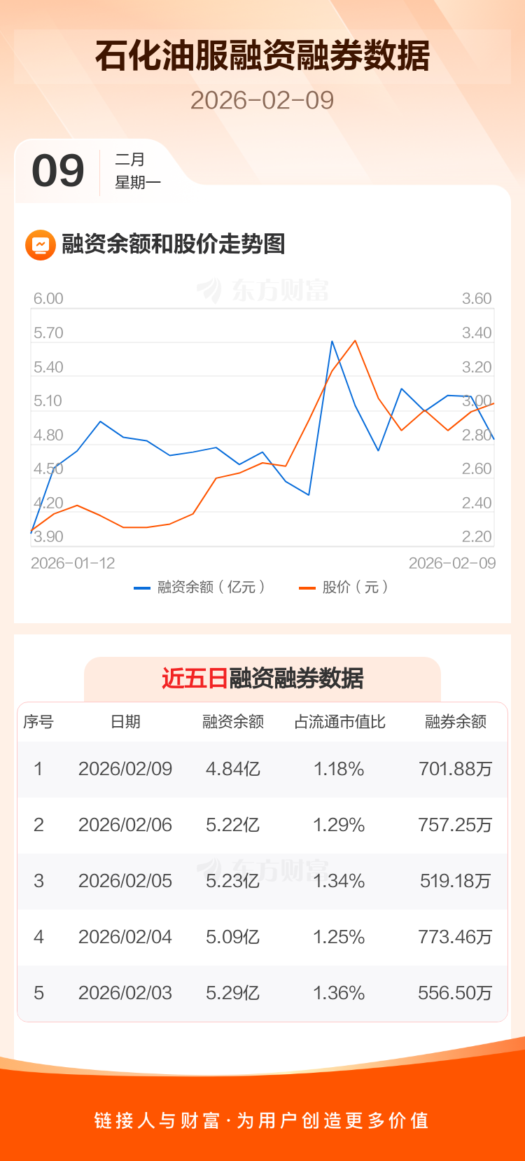 交易所最新数据显示,石化油服于2026年2月9日获融资买入8325.75万元,融资偿还1.22亿元,当日融资净偿还3841.18万元。目前,该股融资余额4.84亿,占流通市值比例为1.18%。