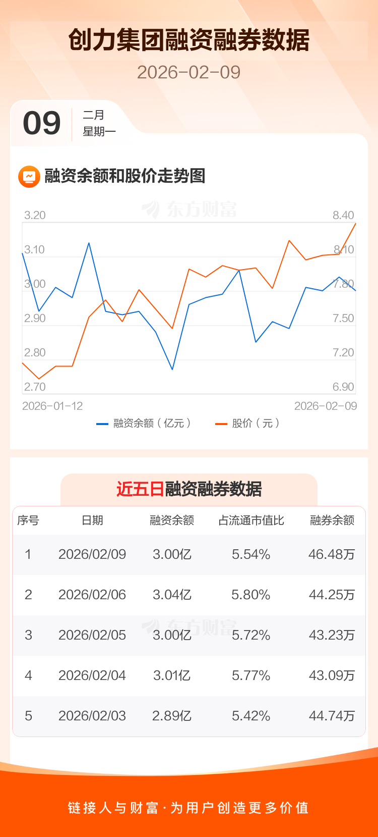 交易所最新数据显示,创力集团于2026年2月9日获融资买入2760.87万元,融资偿还3169.33万元,当日融资净偿还408.46万元。目前,该股融资余额3.00亿,占流通市值比例为5.54%。
