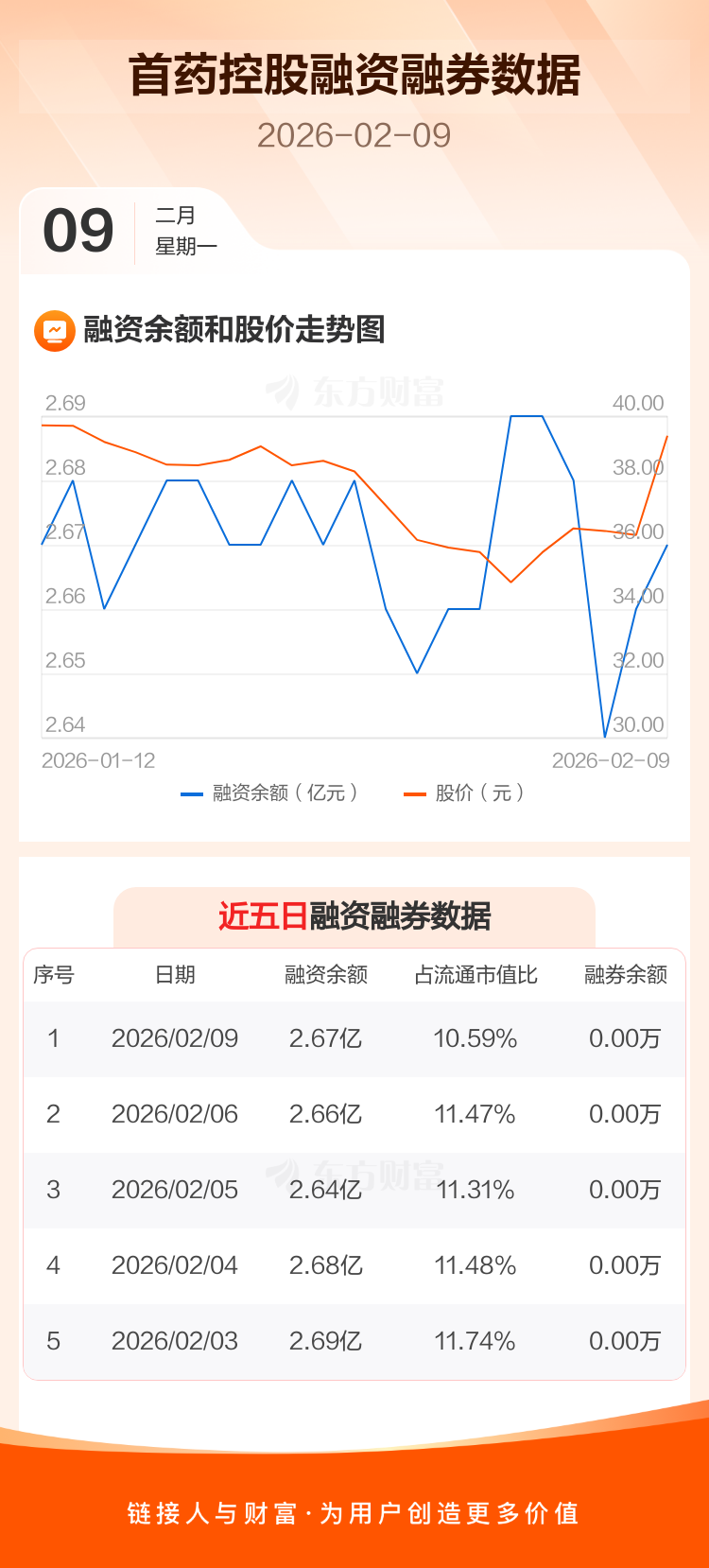 交易所最新数据显示,首药控股于2026年2月9日获融资买入1288.20万元,融资偿还1232.07万元,当日融资净买入56.14万元。目前,该股融资余额2.67亿,占流通市值比例为10.59%。