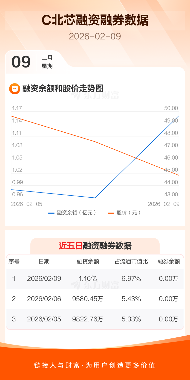 交易所最新数据显示,C北芯于2026年2月9日获融资买入6290.59万元,融资偿还4268.94万元,当日融资净买入2021.65万元。目前,该股融资余额1.16亿,占流通市值比例为6.97%。