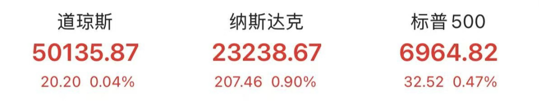 美东时间周一,美股三大指数集体收涨,在科技股的带动下,纳指涨近1%,道指再创历史新高,标普500指数涨近0.5%,几近历史高点。截至收盘,道琼斯指数涨0.04%,报50135.87点;标普500指数涨0.47%,报6964.82点;纳斯达克指数涨0.90%,报23238.67点。