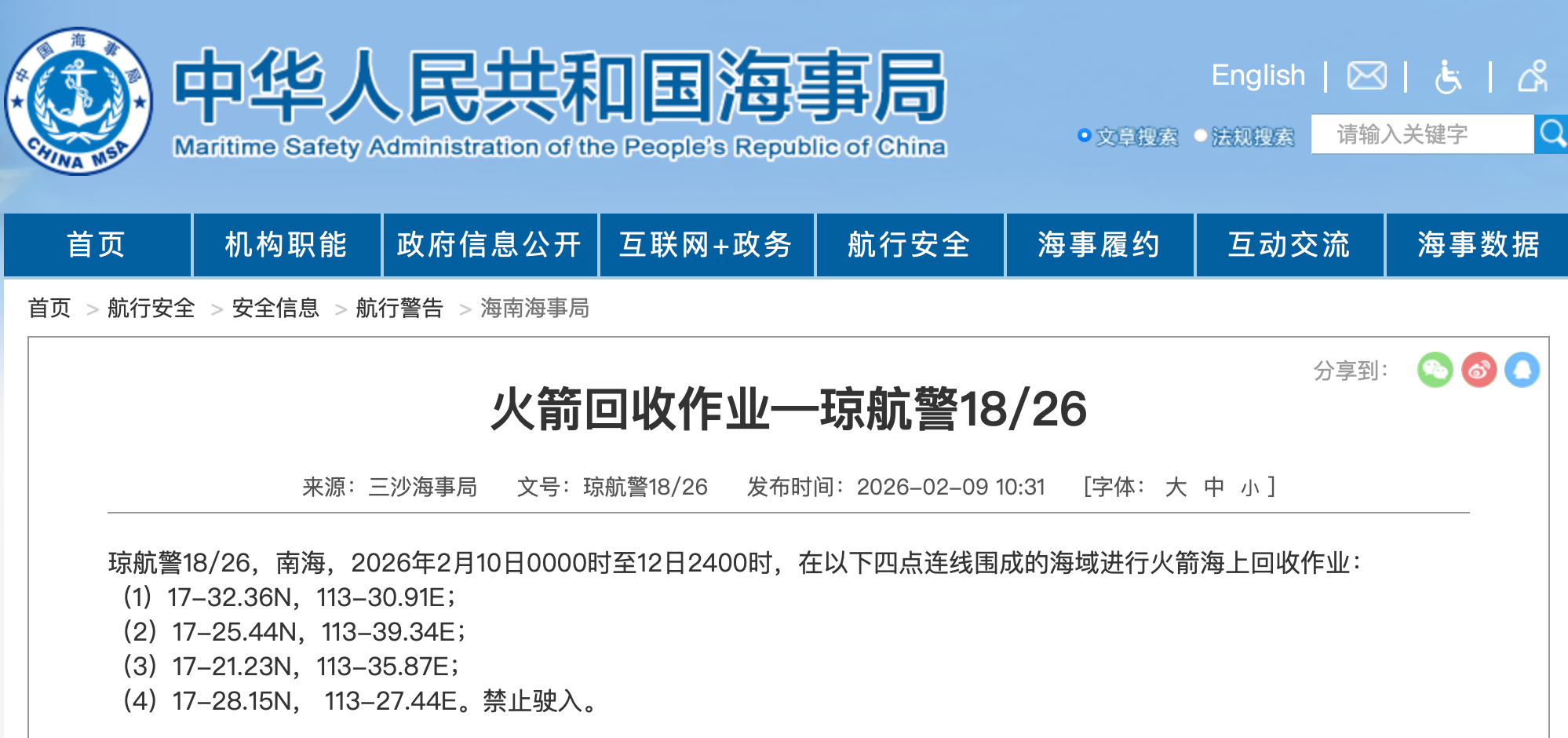 据中国海事局网站消息,三沙海事局发布航行警告,2月10日0时至12日24时,南海部分海域进行火箭海上回收作业,禁止驶入。