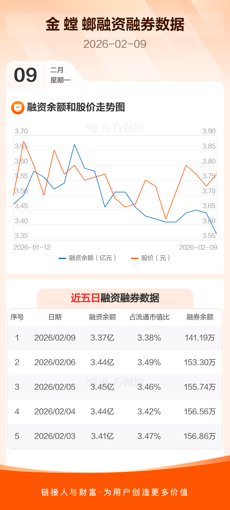 交易所最新数据显示,金 螳 螂于2026年2月9日获融资买入1396.06万元,融资偿还2093.11万元,当日融资净偿还697.05万元。目前,该股融资余额3.37亿,占流通市值比例为3.38%。