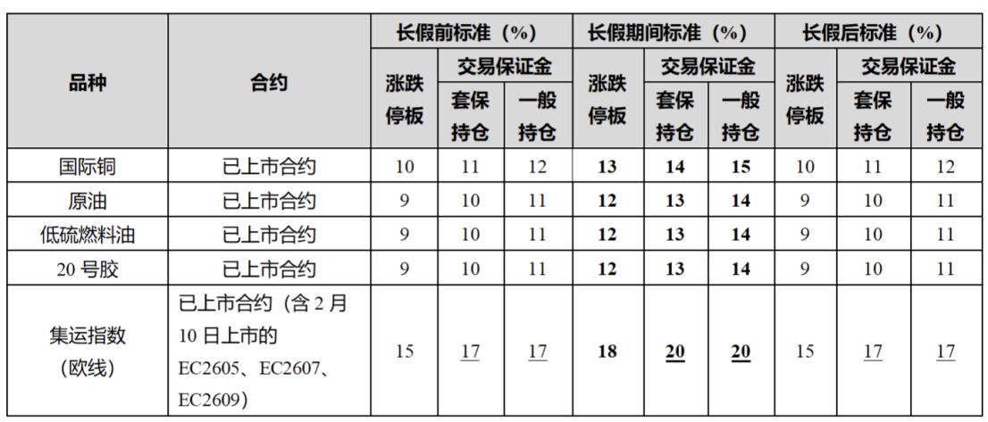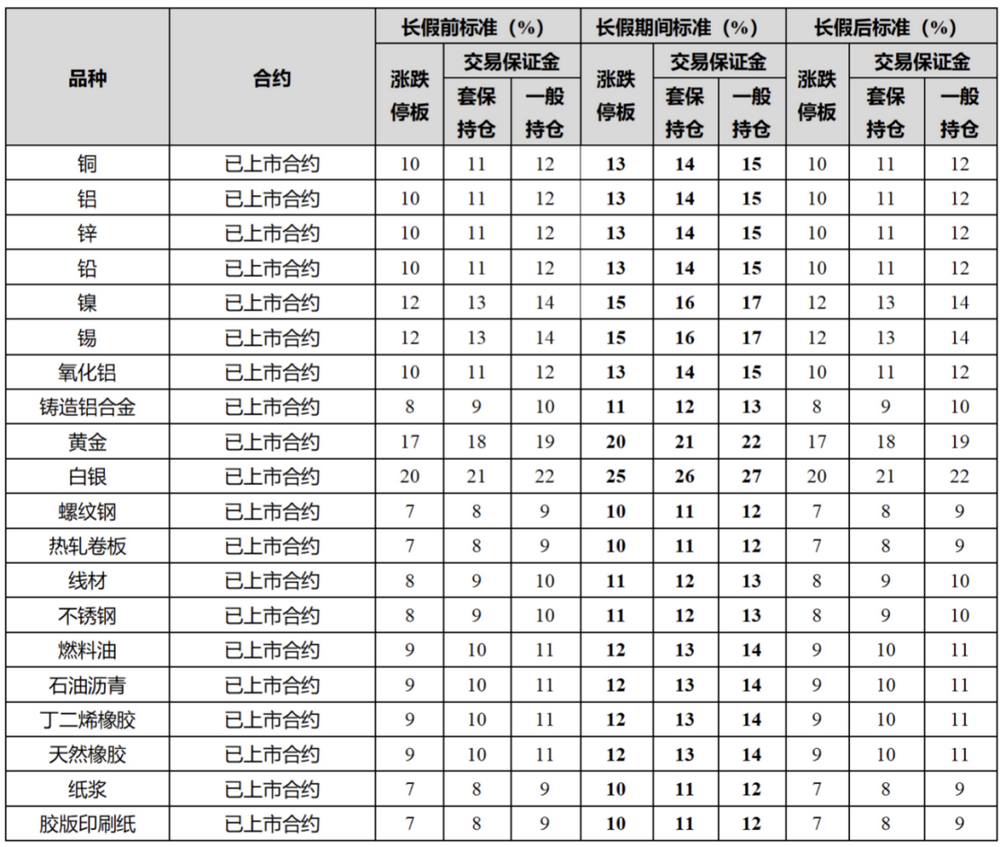 至于仓位的控制情况,25个在上期所和旗下上海国际能源交易中心(以下简称上期能源)上市的期货品种在长假期间和节后均有涨跌停板和交易保证金比例的调整;新上市期货合约交易保证金比例和涨跌停板幅度也同步调整。