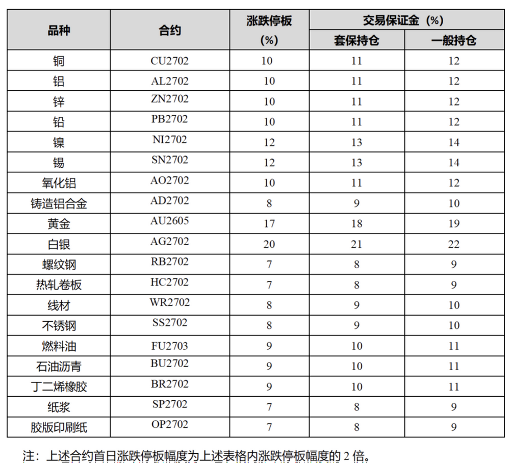 另外,19个期货品种的新上市2702合约的涨跌停板幅度和交易保证金比例也有所调整。