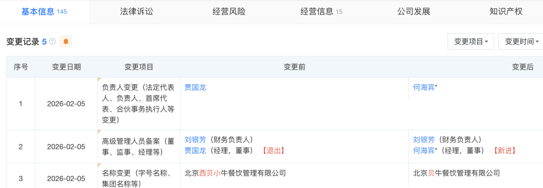 近日,北京西贝小牛餐饮管理有限公司发生工商变更,更名为北京贝牛餐饮管理有限公司。贾国龙卸任该公司法定代表人、经理、董事职位。