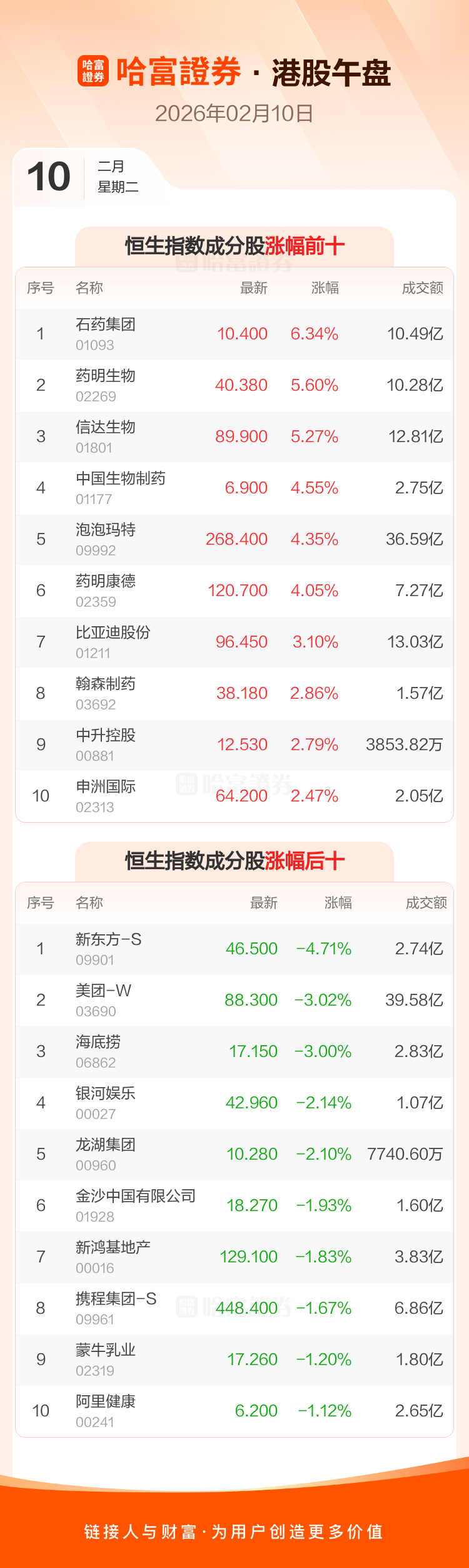 港股2月10日午盘走高,恒生指数收报27173.55点,涨146.39点,涨幅0.54%;恒生科技指数收报5463.39点,涨45.79点,涨幅0.85%。恒生指数成分股中石药集团、药明生物、信达生物涨幅居前,新东方-S、美团-W、海底捞跌幅靠前。恒生科技指数成分股中地平线机器人-W、比亚迪股份、京东集团-SW涨幅居前,美团-W、同程旅行、携程集团-S跌幅靠前。
