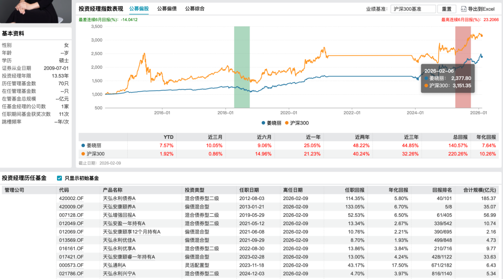 以其代表性产品天弘永利债券B为例,基金定期报告显示,姜晓丽2012年8月管理以来的13个完整年度,有11年录得正收益,截至2025年末,该基金近18年间累计收益率高达167.12%,超越业绩比较基准60.85%。