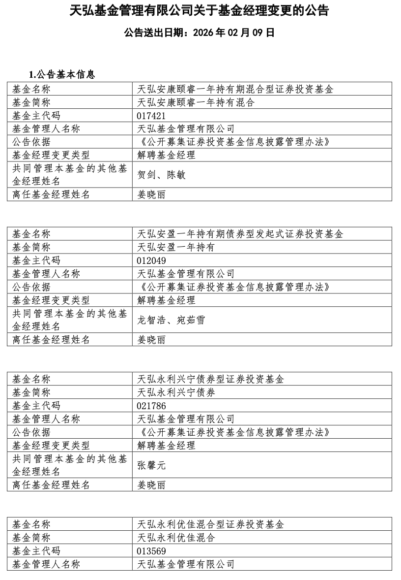 2月9日,天弘基金公告称,于当日卸任其管理的全部10只基金产品。至此,姜晓丽不再担任任何产品的基金经理。据悉,她已提交离职申请。