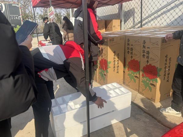 “这个纸箱是公司专门为冬季年宵花设计的,不仅外观美观,也作为第三层保温结构。在洛阳,冬季年宵花80%以上采用此类包装。无论南方或北方,冬季气温普遍较低;南方虽偶有10℃以上,但该包装仍能兼顾保温与安全。”现场一位顺丰快递工作人员对记者介绍道。