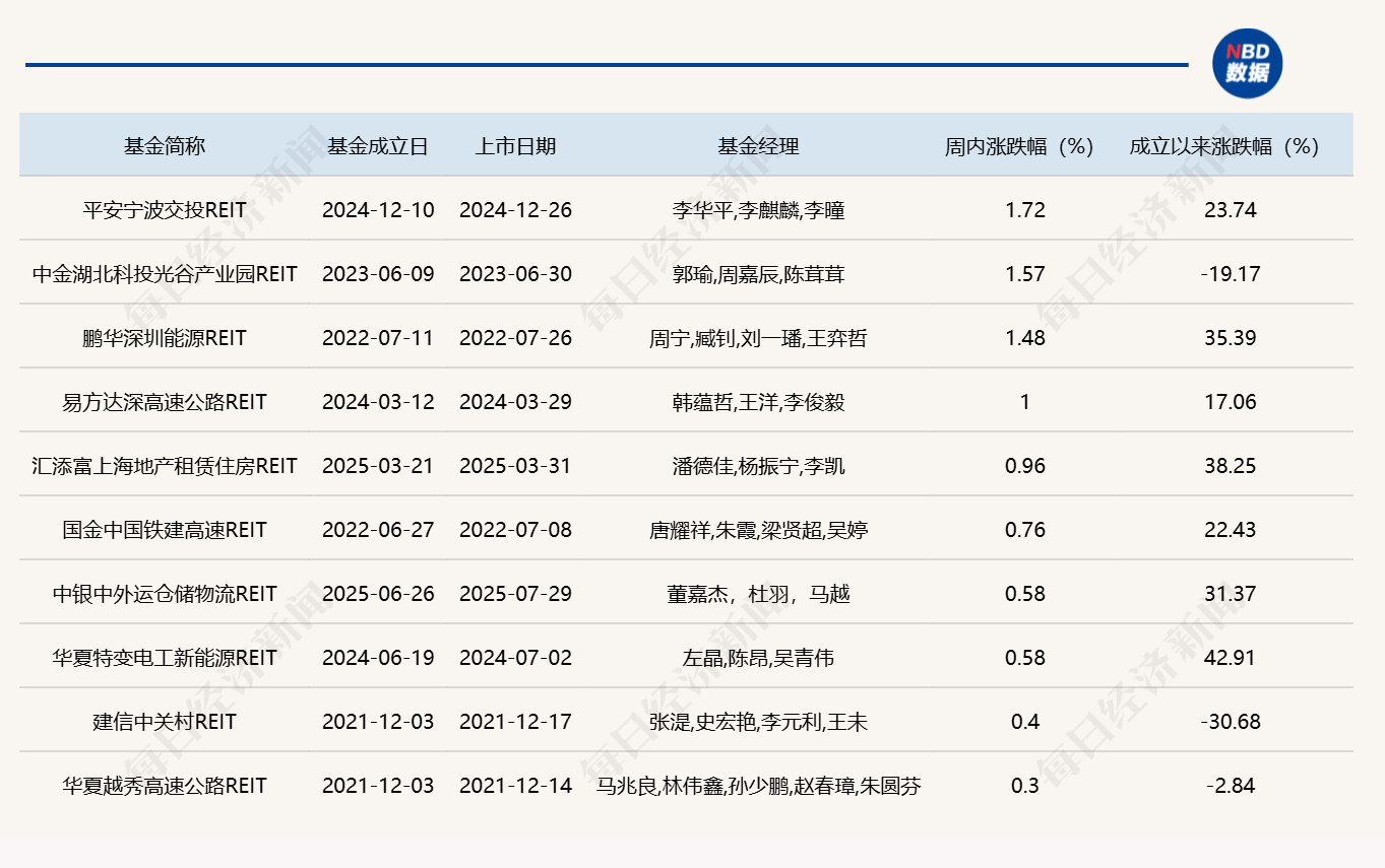 单只产品方面,已上市的79只公募REITs产品中,环比上涨的减少至16只。其中涨幅最大的三只产品分别为平安宁波交投REIT、中金湖北科投光谷产业园REIT和鹏华深圳能源REIT,周内分别上涨1.72%、1.57%和1.48%。