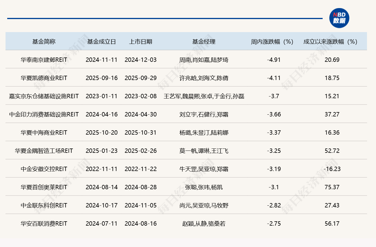 环比下跌的则增加至62只,还有1只表现持平。跌幅最大的三只产品为华泰南京建邺REIT、华夏凯德商业REIT和嘉实京东仓储基础设施REIT,上周分别下跌了4.91%、4.11%和3.70%,此外还有多只产品跌幅超过3%。