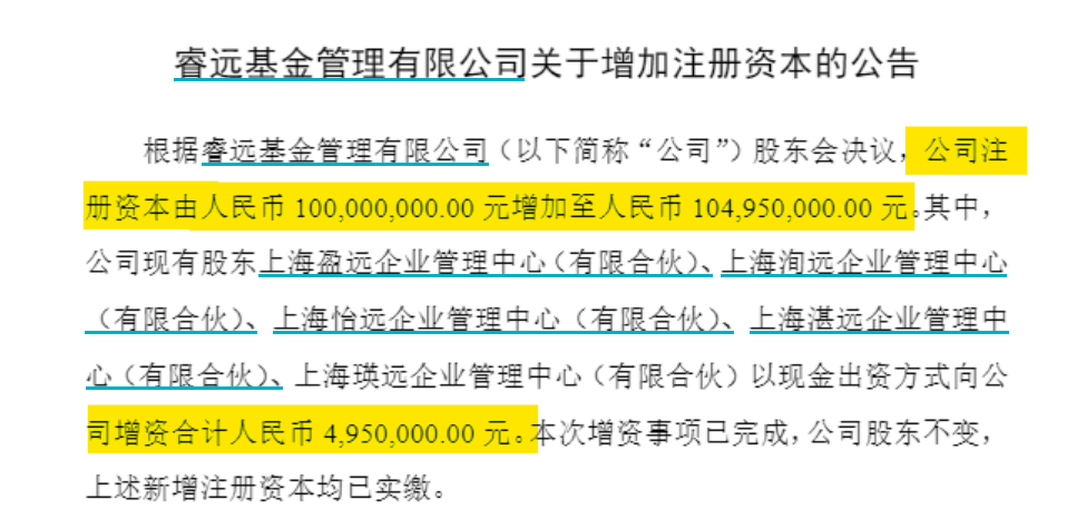 2月10日,睿远基金发布公告称,公司注册资本由1亿元增加至1.0495亿元。其中,公司现有股东上海盈远企业管理中心(有限合伙)、上海洵远企业管理中心(有限合伙)、上海怡远企业管理中心(有限合伙)、上海湛远企业管理中心(有限合伙)、上海瑛远企业管理中心(有限合伙)以现金出资方式,向公司增资合计495万元。本次增资事项已完成,公司股东不变,上述新增注册资本均已实缴。