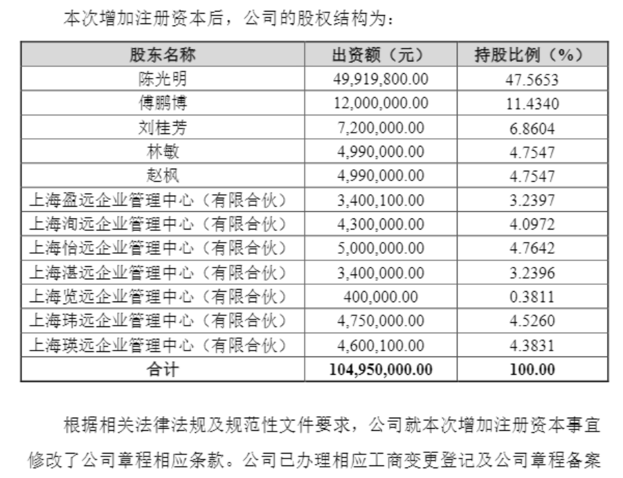 根据公告,本次增加注册资本后,公司的股权结构为:睿远基金实际控制人陈光明的出资额为4991.98万元,持股比例为47.5653%,傅鹏博、刘桂芳、林敏、赵枫在内的自然人股东合计持股27.8038%。此外,7家员工持股平台合计持股24.6309%。