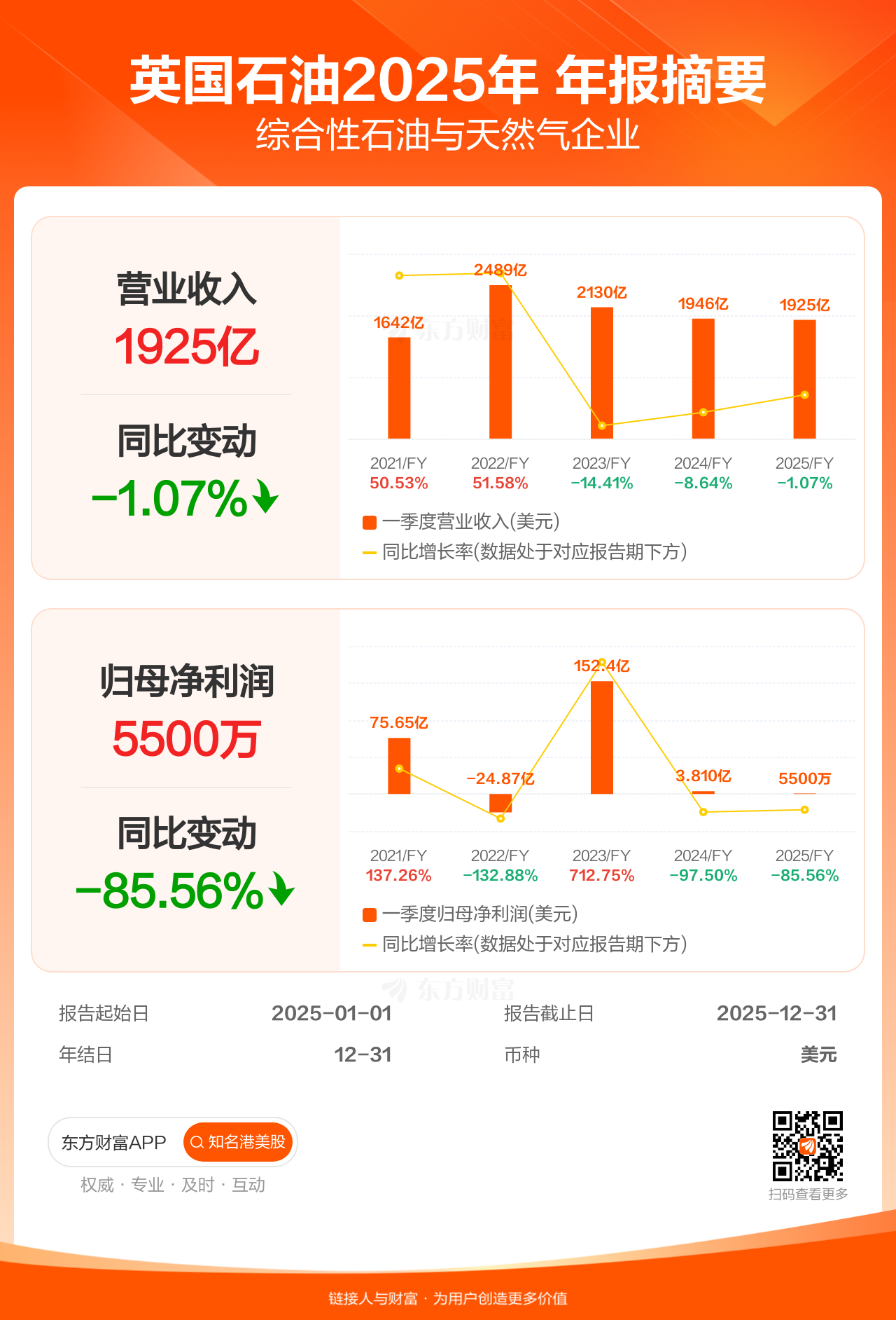 英国石油2月10日发布年报业绩,截至2025年12月31日的12个月内,该公司营业收入1925.49亿美元,同比减少1.07%;公司权益持有人应占溢利(归母净利润)5500.00万美元,同比减少85.56%。