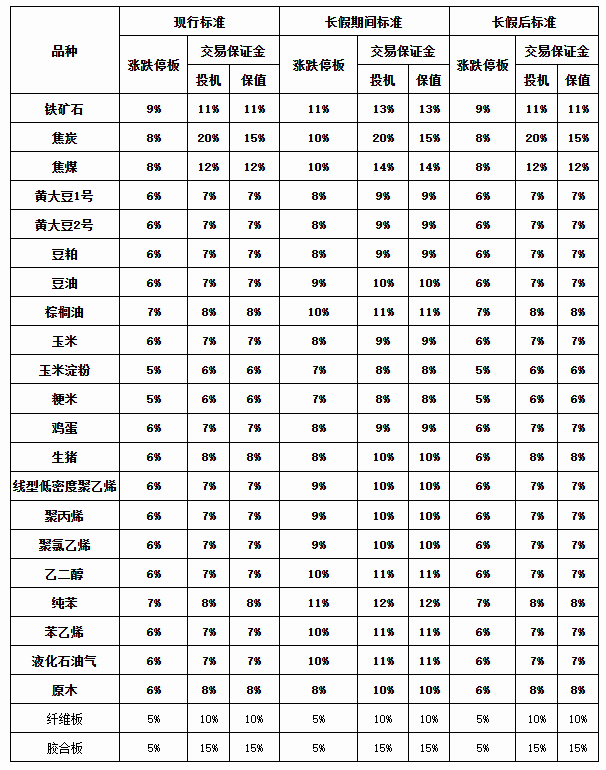 铁矿石、焦炭、焦煤、黄大豆1号、黄大豆2号、豆粕、豆油、棕榈油、玉米、玉米淀粉、粳米、鸡蛋、生猪、线型低密度聚乙烯、聚丙烯、聚氯乙烯、乙二醇、纯苯、苯乙烯、液化石油气和原木品种期货合约涨跌停板幅度和交易保证金水平恢复至节前标准;其他品种期货合约涨跌停板幅度和交易保证金水平维持不变。