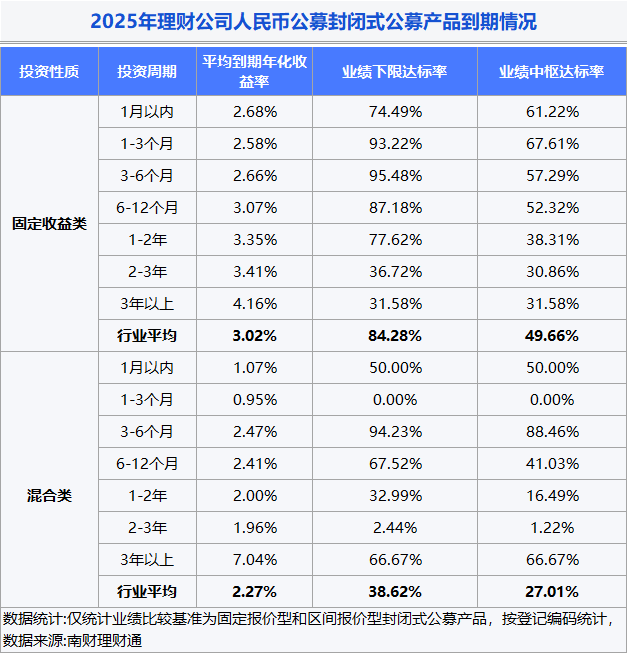 据南财理财通数据,2025年,理财公司11092只样本到期产品的综合业绩中枢达标率为48.76%,业绩下限达标率为82.36%。