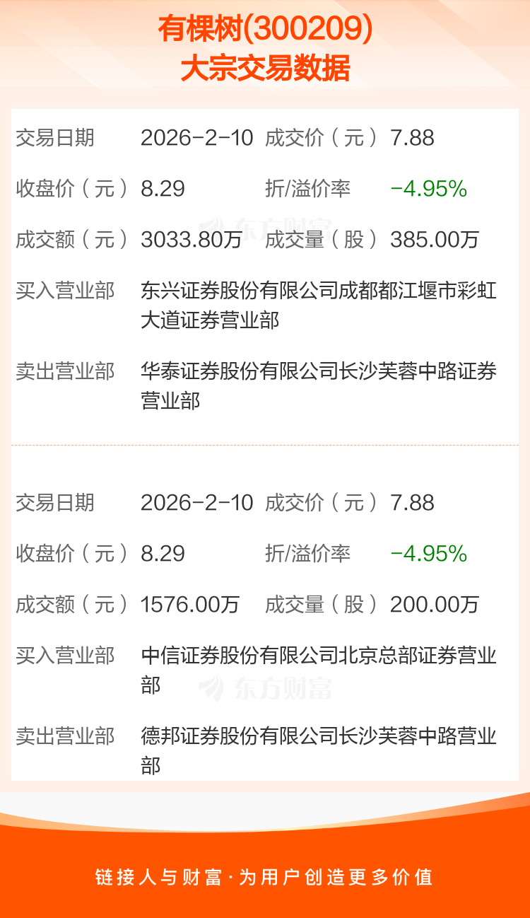 2026年2月10日,有棵树发生2笔大宗交易,共成交585.00万股,成交金额4609.80万元,占其流通市值比例为0.78%。