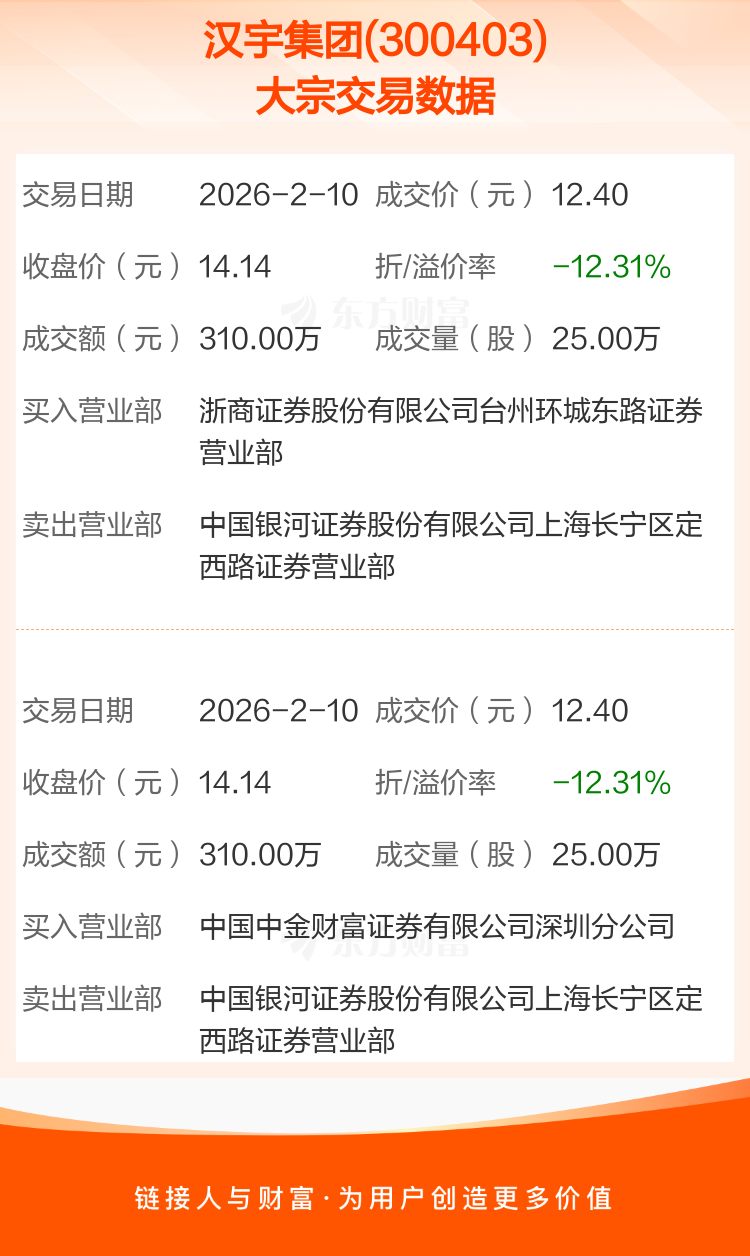2026年2月10日,汉宇集团发生2笔大宗交易,共成交50.00万股,成交金额620.00万元,占其流通市值比例为0.10%。