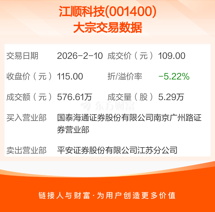 2026年2月10日,江顺科技发生1笔大宗交易,共成交5.29万股,成交金额576.61万元,占其流通市值比例为0.33%。