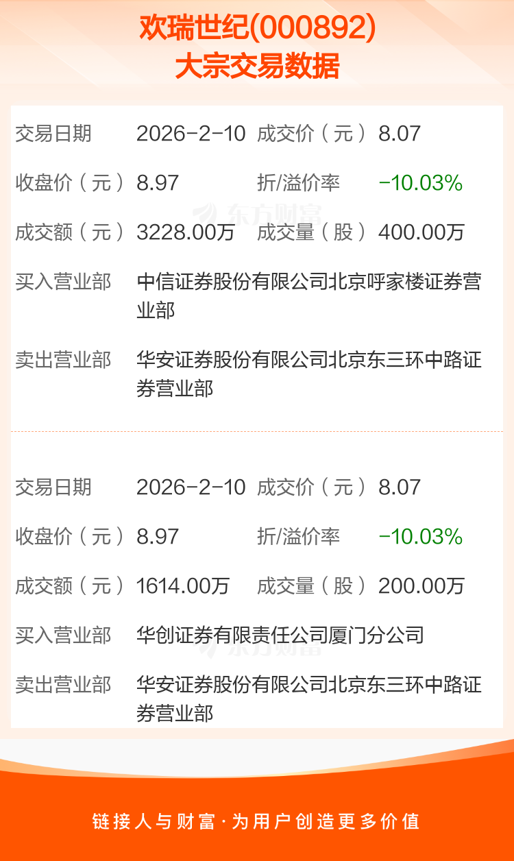 2026年2月10日,欢瑞世纪发生2笔大宗交易,共成交600.00万股,成交金额4842.00万元,占其流通市值比例为0.76%。