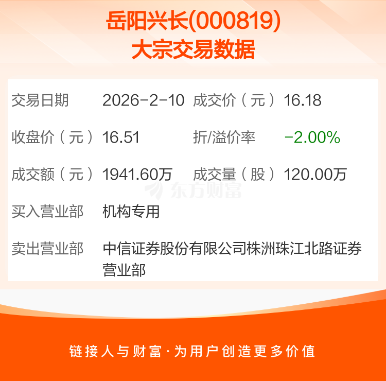 2026年2月10日,岳阳兴长发生1笔大宗交易,共成交120.00万股,成交金额1941.60万元,占其流通市值比例为0.32%。