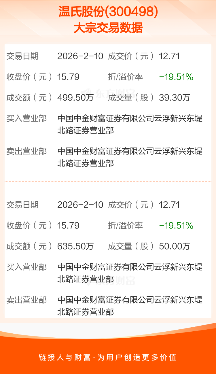 大宗交易:温氏股份成交1135.00万元,折价19.51%(2-10)